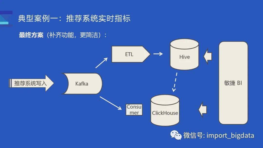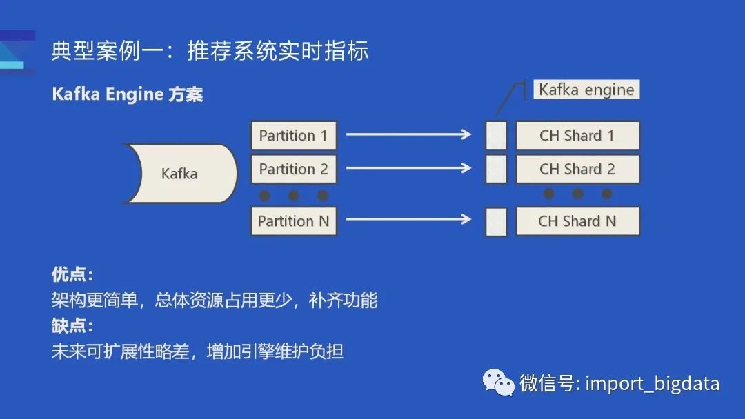 这样的架构相对于使用了 Flink 的方案来说更简单一些,由于少了一次数据传输,整体而言开销会相对小一些,对我们来说也算是补齐了 ClickHouse 的一部分功能(比如 Druid 也支持直接消费 Kafka topic)缺点就是未来可扩展性会更差一些,也略微增加了引擎维护负担。