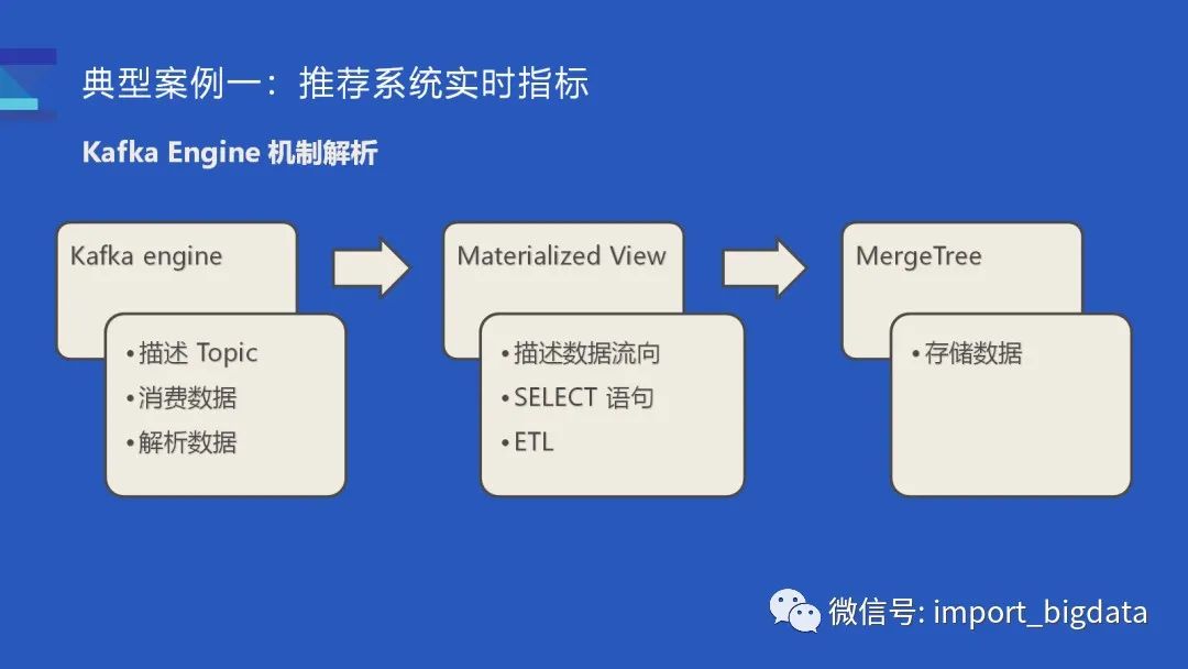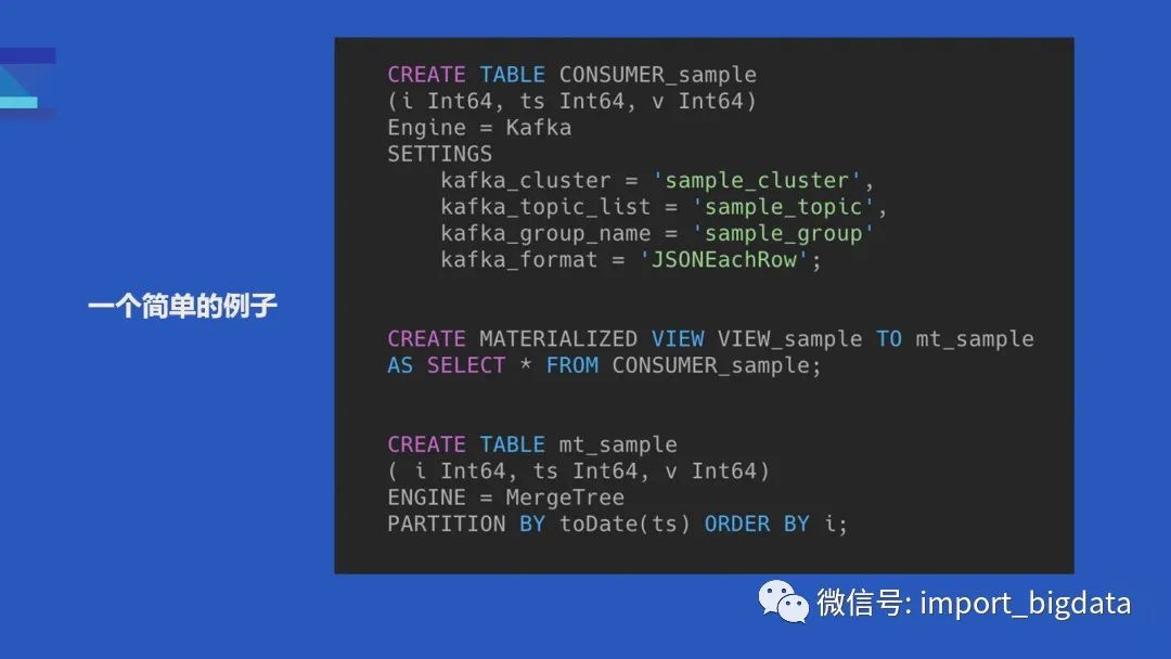 这里简单介绍一下如何使用 kafka 引擎,为了能让 ClickHouse 消费 Kafka 数据,我们需要三张表:首先需要一张存数据的表也就是 MergeTree;然后需要一张 Kafka 表,它负责描述 Topic、消费数据和解析数据;最后需要一个物化视图去把两张表关联起来,它也描述了数据的流向,某些时候我们可以里面内置一个 SELECT 语句去完成一些 ETL 的工作。只有当三张表凑齐的时候我们才会真正启动一个消费任务。