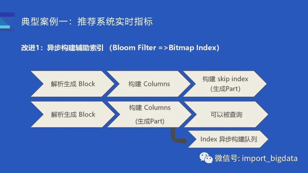第一做的改进是将辅助索引的构建异步化了:在社区实现中,构建一个 Part 分为三步:(1)解析输入数据生成内存中数据结构的 Block;(2)然后切分 Block,并按照表的 schema 构建 columns 数据文件;(3) 最后扫描根据 skip index schema 去构建 skip index 文件。三个步骤完成之后才会算 Part 文件构建完毕。