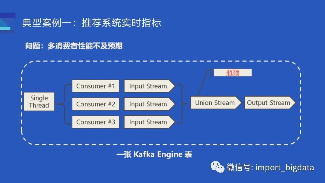 目前实现的 Kafka 表,内部默认只会有一个消费者,这样会比较浪费资源并且性能达不到性能要求。一开始我们可以通过增大消费者的个数来增大消费能力,但社区的实现一开始是由一个线程去管理多个的消费者,多个的消费者各自解析输入数据并生成的 Input Stream 之后,会由一个 Union Stream 将多个 Input Stream 组合起来。这里的 Union Stream 会有潜在的性能瓶颈,多个消费者消费到的数据最后仅能由一个输出线程完成数据构建,所以这里没能完全利用上多线程和磁盘的潜力。