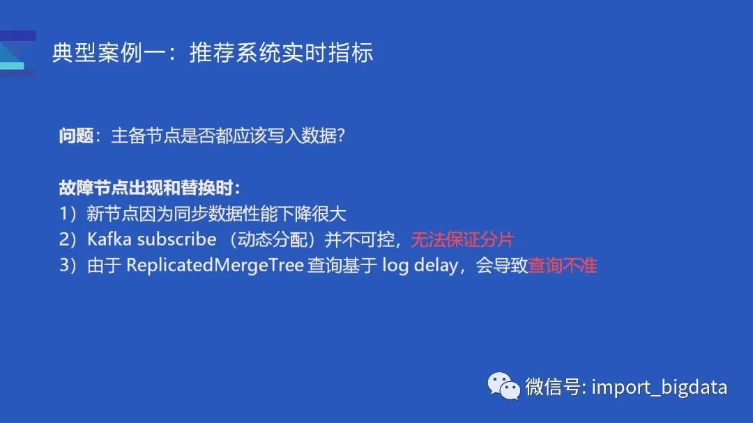 为什么呢?因为一旦节点故障,会带来一系列不好处理的问题。(1)首先当出现故障节点的时候,一般会替换一个新的节点上来,新替换的节点为了恢复数据,同步会占用非常大的网络和磁盘 IO,这种情况,如果原来主备有两个消费者就剩一个,此时消费性能会下降很大(超过一倍),这对于我们来说是不太能接受的。(2)早先 ClickHouse Kafka engine 对 Kafka partition 的动态分配支持不算好,很有可能触发重复消费,同时也无法支持数据分片。因此我们默认使用静态分配,而静态分配不太方便主备节点同时消费。(3)最重要的一点,ClickHouse 通过分布式表查询 ReplicatedMergeTree 时,会基于 log delay 来计算 Query 到底要路由到哪个节点。一旦在主备同时摄入数据的情况下替换了某个节点,往往会导致查询结果不准。
