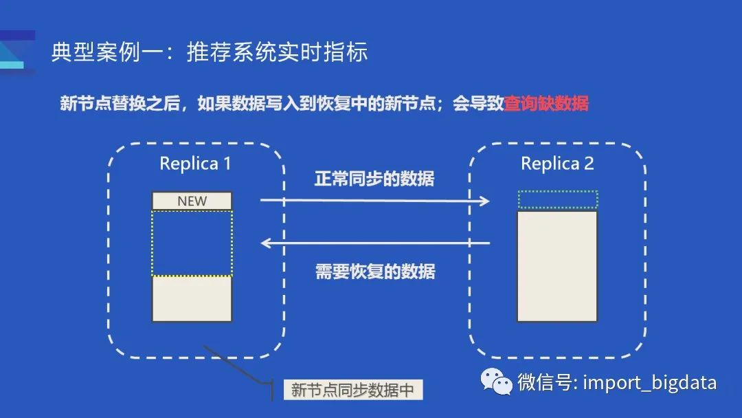 这里简单解释一下查询不准的场景。一开始我们有两副本,Replica #1 某时刻出现故障,于是替换了一个新的节点上来,新节点会开始同步数据,白框部分是已经同步过的,虚线黄框是正在恢复的数据,新写入的白色框部分就是新写入的数据。如果此时两个机器的数据同步压力比较大或查询压力比较大,就会出现 Replica #1 新写入的数据没有及时同步到 Replica #2 ,也就是这个绿框部分,大量历史数据也没有及时同步到对应的黄框部分,这个情况下两个副本都是缺少数据的。因此无论是查 Replica #1 还是 Replica #2 得到的数据都是不准的。