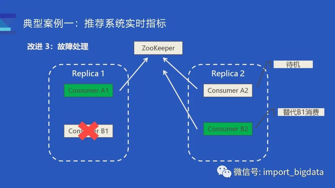 对于替换节点导致查询不准问题,我们先尝试解决只有一个节点消费的问题。为了避免两个节点消费这个数据,改进版的 Kafka engine 参考了 ReplicatedMergeTree 基于 ZooKeeper 的选主逻辑。对于每一对副本的一对消费者,(如上图 A1 A2),它们会尝试在 ZooKeeper 上完成选主逻辑,只有选举称为主节点的消费者才能消费,另一个节点则会处于一个待机状态。一旦 Replica #1 宕机,(如上图 B1 B2 ),B1 已经宕机连不上 ZooKeeper 了,那 B2 会执行选主逻辑拿到 Leader 的角色,从而接替 B1 去消费数据。