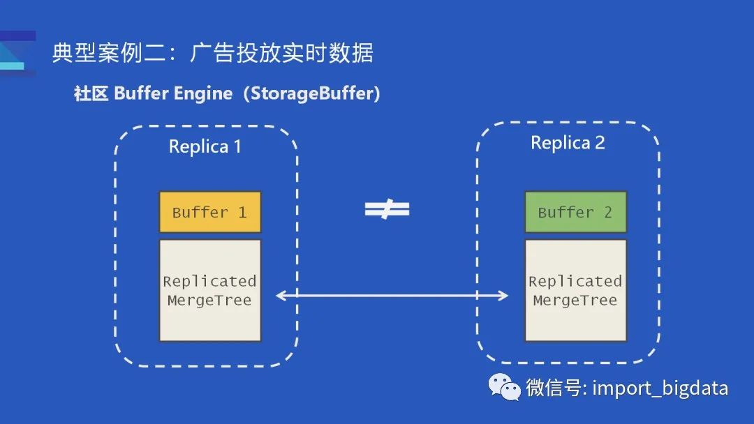 单次写入生成过多 parts 的问题其实也有方案解决。社区提供了 Buffer Engine,可以在内存中缓存新写入的数据,从而缓解 parts 高频生成的问题。不过社区文档也介绍了,Buffer Engine 的缺点是不太能配合 ReplicatedMergeTree 一起工作。如果数据写入到了一对副本(如上图),那么 Buffer #1 和 Buffer #2 缓存的数据其实是不一样的,两个 Buffer 仅缓存了各自节点上新写入的数据。对于某个查询而言,如果查询路由到 Replica #1,那查询到的数据是 MergeTree 部分的数据加上 Buffer #1,这部分的数据其实是和 Replica #2 的 MergeTree 加上 Buffer2 的数据并不等价,即便 MergeTree 的数据是相同的。