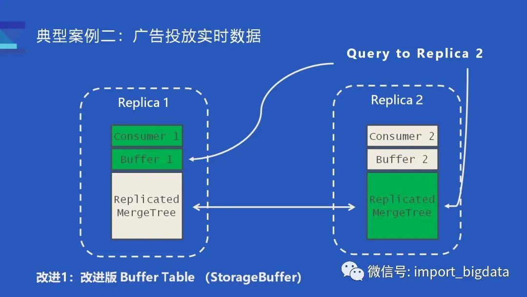 对于任何发送到 Replica #1 的查询,数据肯定是完整的;而对于发送到 Replica #2 的查询则会额外构建一个特殊的查询逻辑,从另一个副本的 Buffer #1 读取数据。这样发送到 Replica #2 的查询,获取到数据就是绿框部分也就是 Replica #2 的 MergeTree 再加上 Replica #1 的 Buffer,它的执行效果是等价于发送到 Replica #1 的查询。