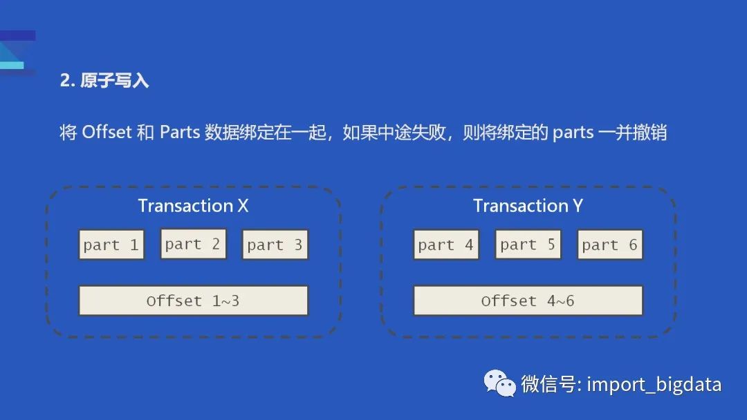 每次消费时,会默认创建一个事务,由事务负责把 Part 数据和 Offset 一同写入磁盘中:如果消费的途中写入 part #1 part #2 失败了,事务回滚的时候会把 Offset 和 part #1 part #2 一并回滚,然后从 Part #1 的位置重新消费并重试提交 offset 1-3。