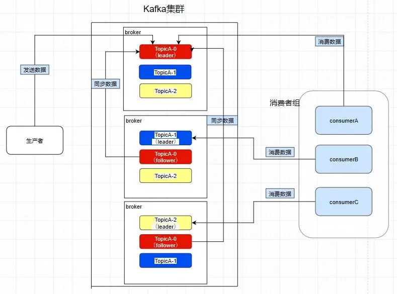 创建一个TopicA的主题,3个分区分别存储在不同的服务器,也就是broker下面。Topic是一个逻辑上的概念 ,并不能直接在图中把Topic的相关单元画出