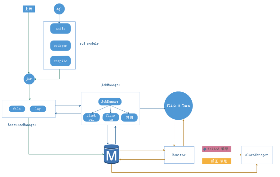 2018年我们发布了第一版的实时计算平台,整体基于Flink1.7版本开发,提供SQL和JAR包两种开发方式。JAR包任务比较简单,用户基于官方依赖库开发,上传即可;SQL方式我们采用了Antrl自定义了自己的一套SQL语法,实现了DDL、SET、CREATE FUNCTION、DIM JOIN 等语义,实现了流表的创建、属性设置、函数创建、以及维表JOIN等功能,然后集成FLINK1.7本身SQL的能力实现了一套SQL的开发能力,其整体架构如下: