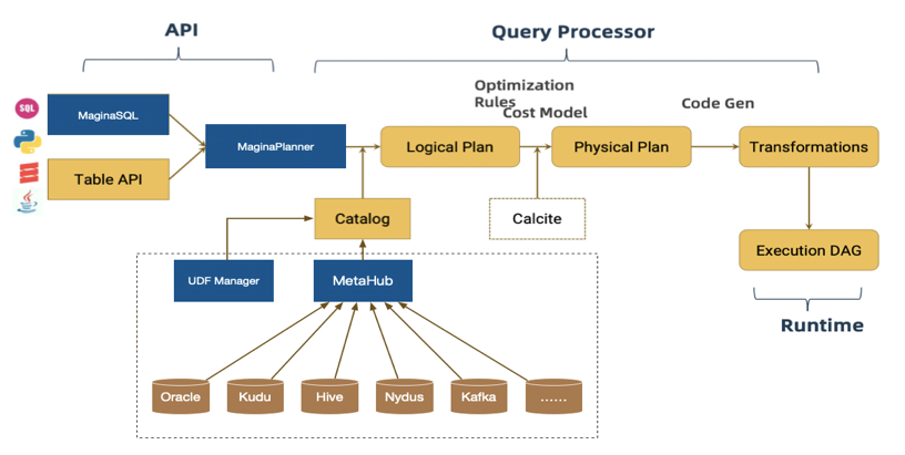 Flink从1.9开始提供了全新的Catalog API,外部的Calalog可以很方便的插拔式的接入Flink,我们希望基于这套全新的CatalogAPI,将Flink和元数据中心打通,将元数据中心作为Flink SQL的元数据管理系统,为了实现这一想法我们实现了自己MaginaCatalog,我们主要做了以下几个事情: