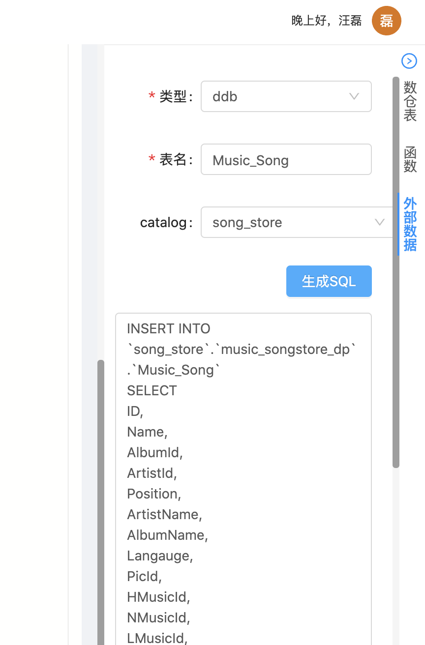 元数据的搜索和代码生成功能,方便用户查找的想要外部表,并生成相应的SQL代码