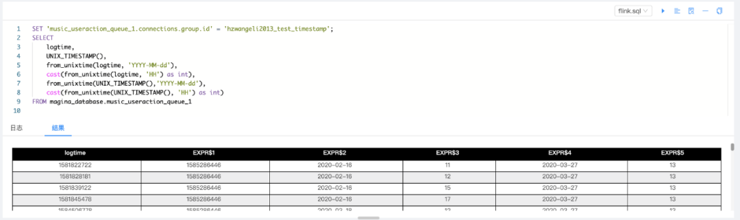 public class CodeDemo extends MaginaBase {protected void run(String args[]) throws Exception {Table table = session.sql("SET 'ods_music_ua_queue_3.connections.group.id' = 'skd_jww_test';\\n" +"select os from magina_dw_online.music_ods.ods_music_ua_queue_3 where os = 'pc';").get();DataStream<Row> result = toDataStream(table);result.print()}}