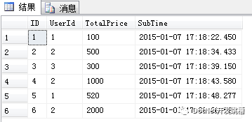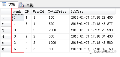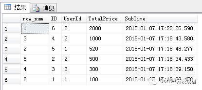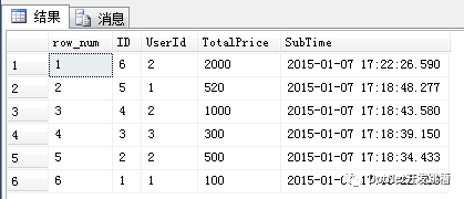 注意:在使用row_number实现分页时需要特别注意一点,over子句中的order by 要与Sql排序记录中的order by 保持一致,否则得到的序号可能不是连续的。下面我们写一个例子来证实这一点,将上面Sql语句中的排序字段由SubTime改为TotalPrice。另外提一下,对于带有子查询和CTE的查询,子查询和CTE查询有序并不代表整个查询有序,除非显示指定了order by。
