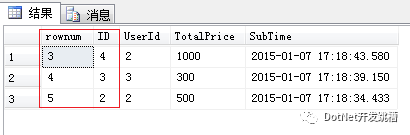 利用row_number可以实现web程序的分页,我们来查询指定范围的表数据。例:根据订单提交时间倒序排列获取第三至第五条数据。