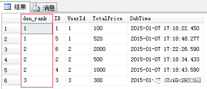 dense_rank函数的功能与rank函数类似,dense_rank函数在生成序号时是连续的,而rank函数生成的序号有可能不连续。dense_rank函数出现相同排名时,将不跳过相同排名号,rank值紧接上一次的rank值。在各个分组内,rank()是跳跃排序,有两个第一名时接下来就是第四名,dense_rank()是连续排序,有两个第一名时仍然跟着第二名。将上面的Sql语句改由dense_rank函数来实现。
