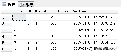Order表的总记录数是6条,而上面的Sql语句ntile函数指定的组数是4,那么Sql Server2005是怎么来决定每一组应该分多少条记录呢?这里我们就需要了解ntile函数的分组依据(约定)。
