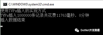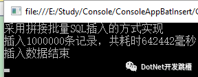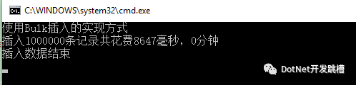 #region 方式二 static void InsertTwo() { Console.WriteLine("使用Bulk插入的实现方式"); Stopwatch sw = new Stopwatch(); DataTable dt = GetTableSchema(); using (SqlConnection conn = new SqlConnection(StrConnMsg)) { SqlBulkCopy bulkCopy = new SqlBulkCopy(conn); bulkCopy.DestinationTableName = "Product"; bulkCopy.BatchSize = dt.Rows.Count; conn.Open(); sw.Start(); for (int i = 0; i < totalRow;i++ ) { DataRow dr = dt.NewRow(); dr[0] = Guid.NewGuid(); dr[1] = string.Format("商品", i); dr[2] = (decimal)i; dt.Rows.Add(dr); } if (dt != null && dt.Rows.Count != 0) { bulkCopy.WriteToServer(dt); sw.Stop(); } Console.WriteLine(string.Format("插入{0}条记录共花费{1}毫秒,{2}分钟", totalRow, sw.ElapsedMilliseconds, GetMinute(sw.ElapsedMilliseconds))); } } static DataTable GetTableSchema() { DataTable dt = new DataTable(); dt.Columns.AddRange(new DataColumn[] { new DataColumn("Id",typeof(Guid)), new DataColumn("Name",typeof(string)), new DataColumn("Price",typeof(decimal))}); return dt; } #endregion