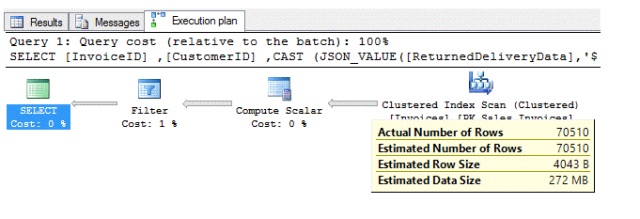 切记JSON_VALUE 返回一个单一的文本值(nvarchar(4000))。需要转换返回值到一个时间字段中,然后分离年来筛选查询条件。实际执行计划如下: