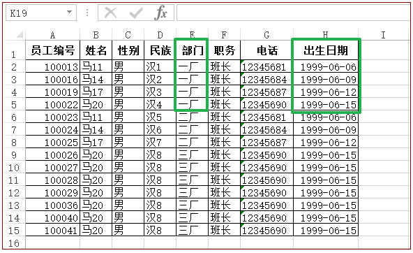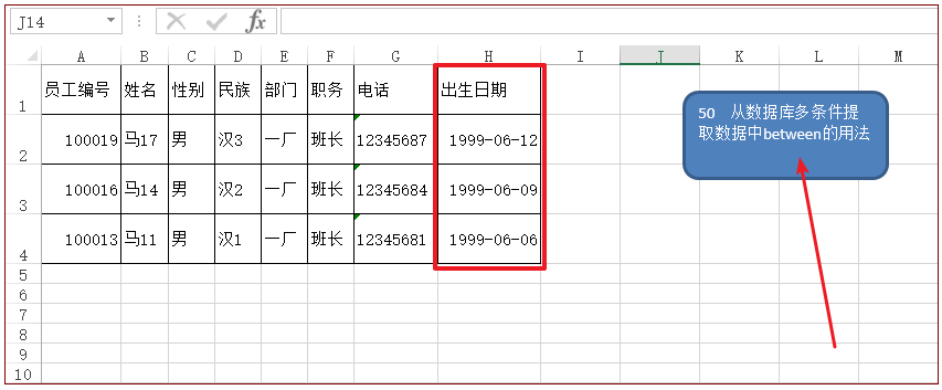 我要把“出生日期”为1999/6/6和1999/6/12两者之间的人员提取出来(含两个开始和结束时间),其他的条件是:“部门”为“一厂” “ 职务”为“班长”,我们如何写代码呢?