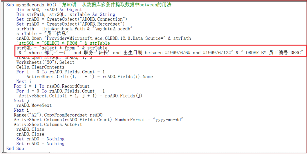 Sub mynzRecords_50() '第50讲 从数据库多条件提取数据中between的用法