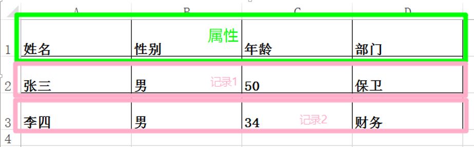 2、关系的结构, 就是表头。这表明了事物需要具有哪些属性,如上面的例子,在描述一个人员时的属性有:姓名;性别:年龄:组织