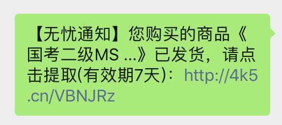 收货方式:所有级别的题库信息通过【手机短信秒发】,为了大家容易辨识,短信内容是以【无忧通知】开头的,且必须在7天有效期内提取卡密信息的,如下图所示: