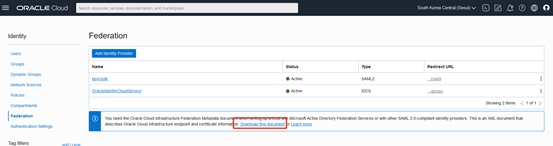 1. 在 Oracle OCI控制台中,获取与KeyCloak 建立信任关系所需的SAML联合元数据。