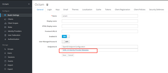 2. 在KeyCloak中,创建reaml,user,group,并获取与OCI IAM建立信任关系所需的SAML联合元数据