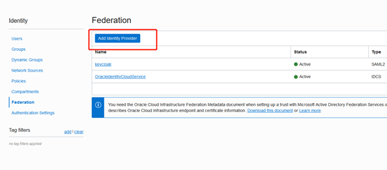 以管理员省份登录OCI, 打开服务菜单,选择Identity & Security,选择Identity组下面的Federation,出现如下的界面,选择Dowanload the document,下载SAML的联合元数据