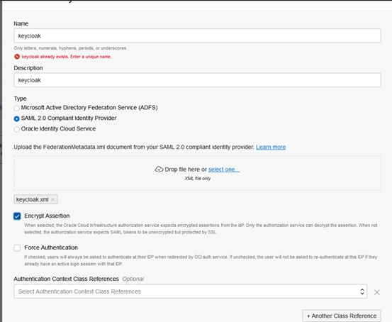 点击Select File导入OCI的SAML协议的联合元数据文件