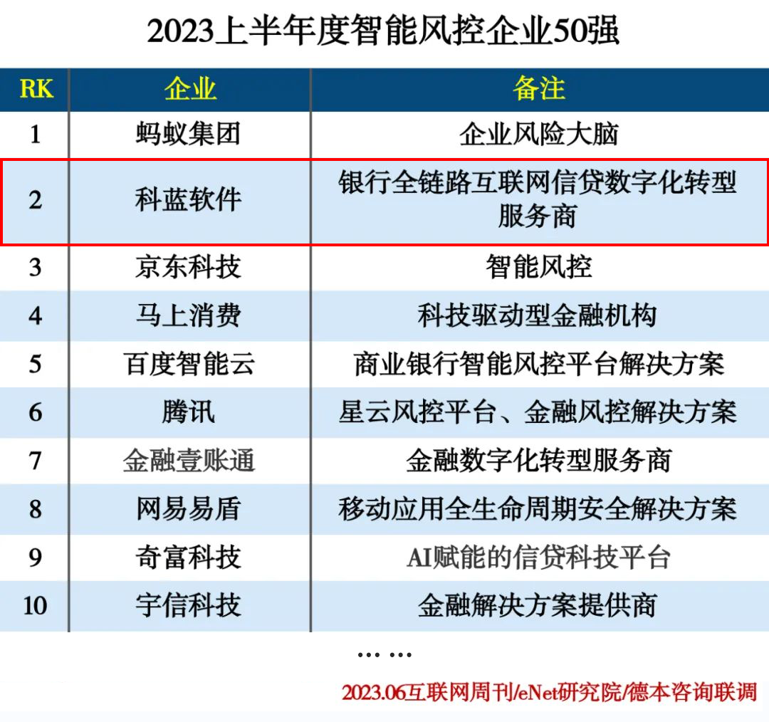 6月15日,由中国科学院主管的《互联网周刊》、eNet研究院、德本咨询联合发布《2023智能风控企业50强》,科蓝软件在智能风控领域拥有其他金融科技公司难以比拟的竞争力,凭借在智能风控领域的技术创新实力及丰富的实践案例,实力登榜第二名。