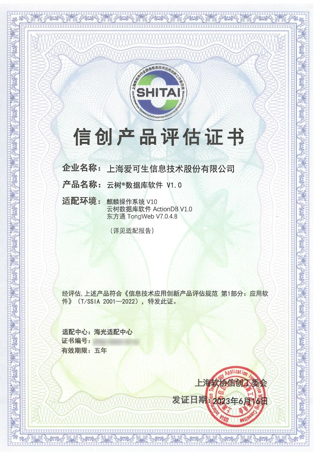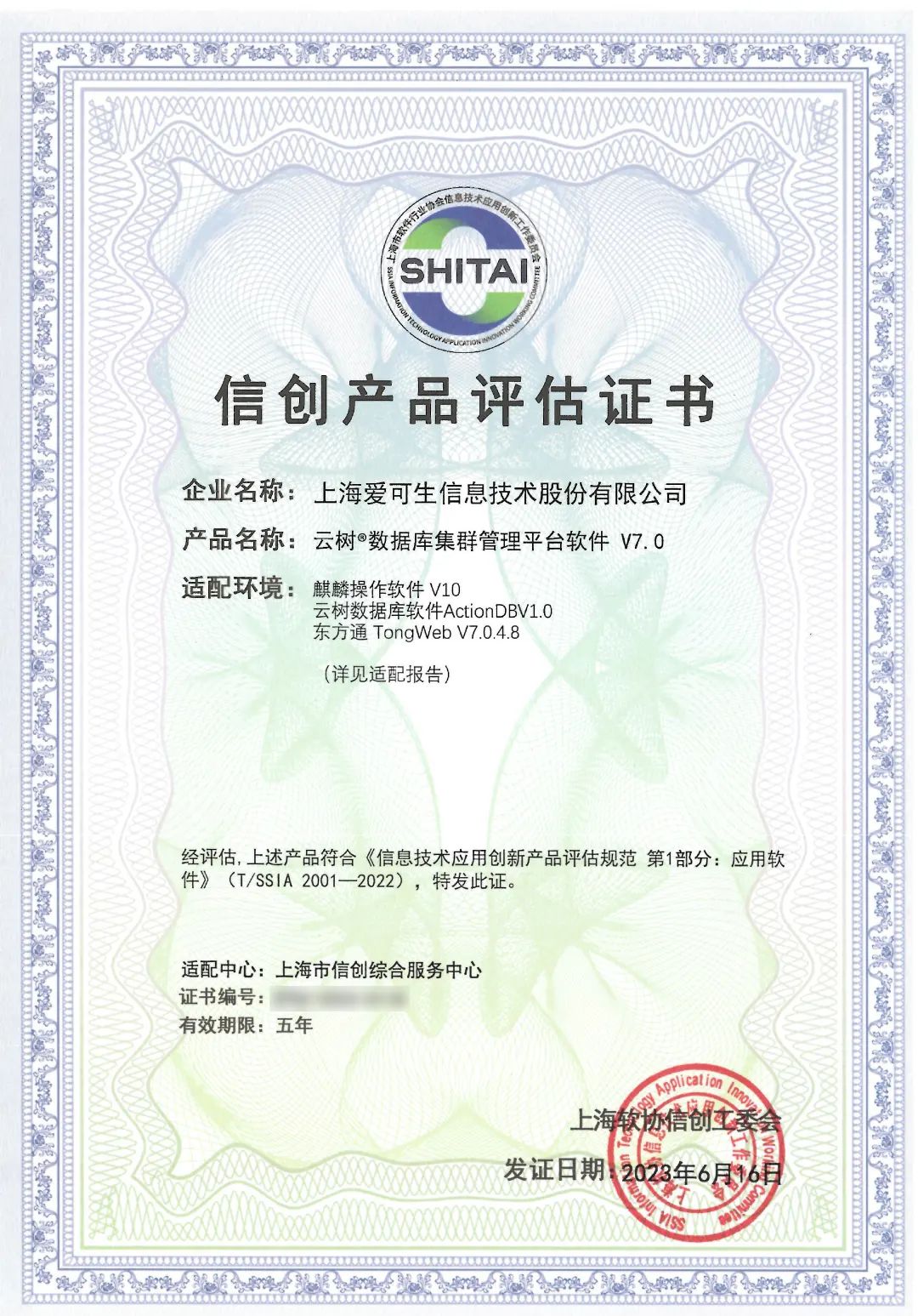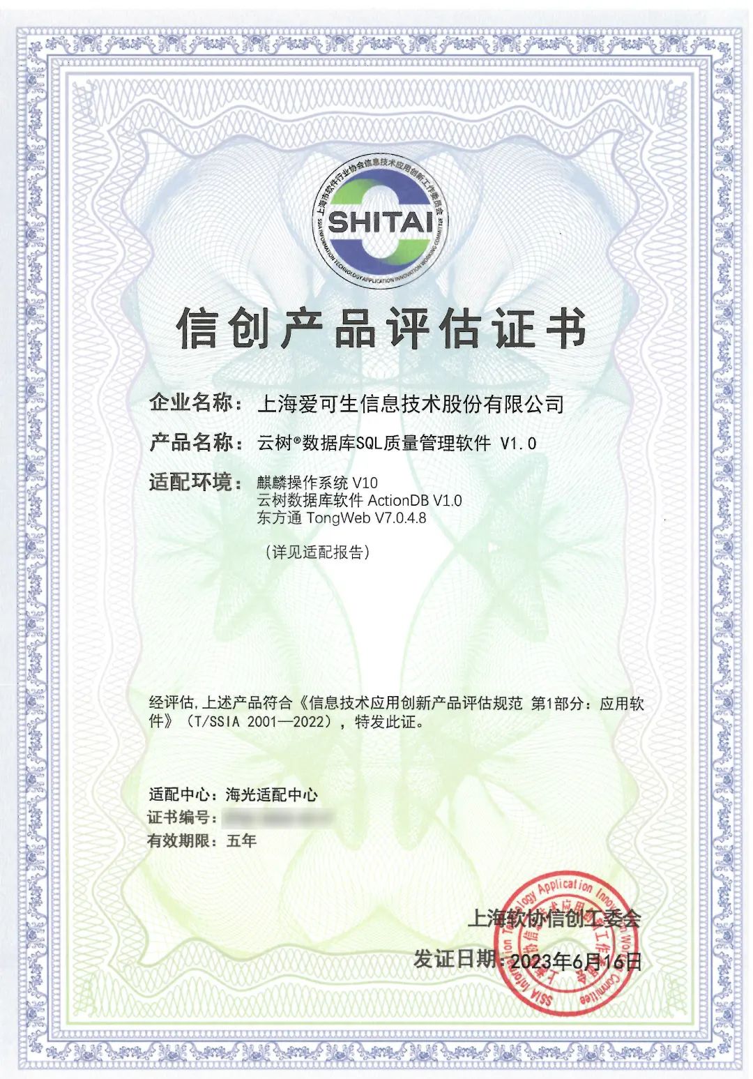2023年6月,依据《信息技术应用创新产品评估规范第1部分:应用软件》(T/SSIA 2021--2022),经严格评估,爱可生自主研发的云树®数据库软件(简称ActionDB)、云树®数据库集群管理平台软件(简称CTREE DMP)、云树®数据库SQL质量管理软件(简称CTREE SQLE)分别获得上海软协信创工委会颁发的“信创产品评估证书”。