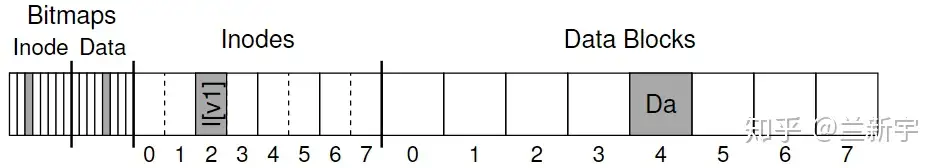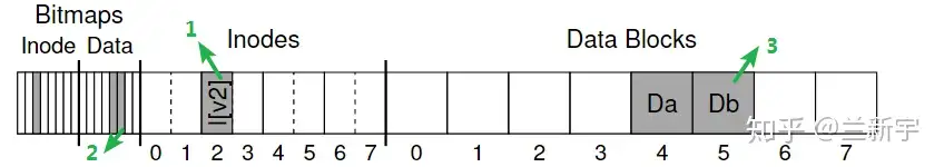 假设一个文件系统在磁盘上的分布是这样的:其中包括一个文件的inode(即I[v1]),data block(即Da)和记录分配状态的inode bitmap, data bitmap。