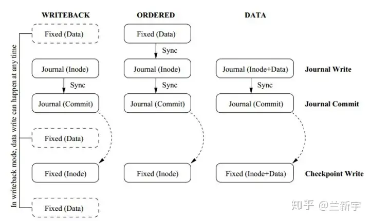 此时,write barrier只能保证对meta data(包括inode和bitmap)的真实写操作发生在journal的写操作之后,由于磁盘写操作的out of order特性,user data的真实写操作则可能发生在此过程中的任何节点,这种模式被称为"Writeback"。
