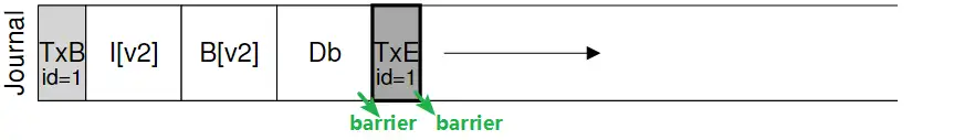 待journal write顺利完成以后,再写入TxE(这一步叫做 journal commit),然后再执行一次barrier操作,以保证数据的写入是发生在journal完成之后(write barrier在保证数据一一致性的同时,会不可避免地对性能造成影响,如果能够接受不使用barrier带来的潜在风险,可以在mount文件系统的时候使用"nobarrier"选项)。