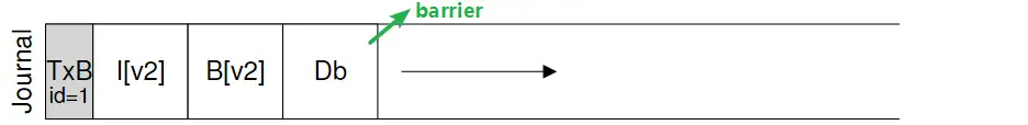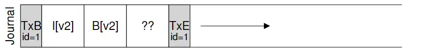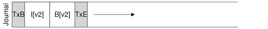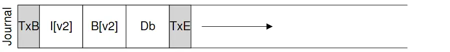 还是前面那个例子,现在我们要更新磁盘上的inode(I[v2]), bitmap(B[v2])和data block (Db)。在更新这个数据之前,我们把这个更新操作的步骤(称为一个 transcation),加上分别表示这个transcation开始和结束的TxB和TxE,写入磁盘。