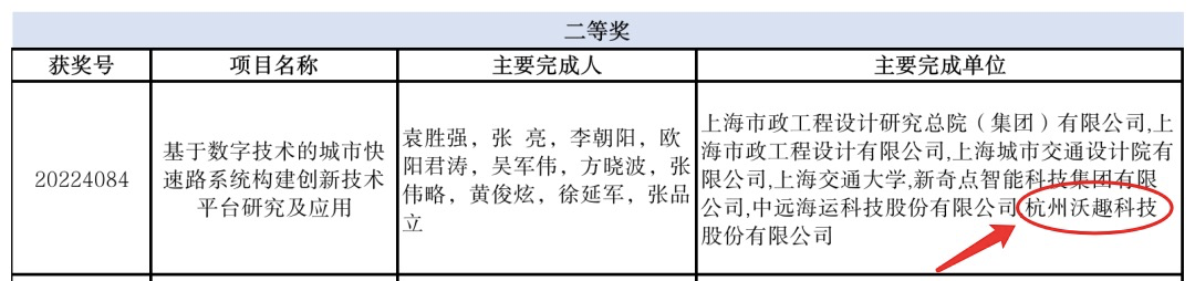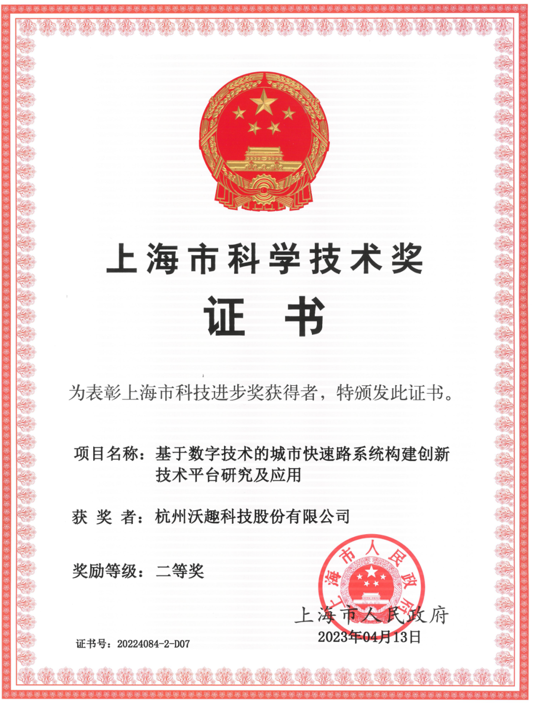 沃趣科技作为主要完成单位之一,参与完成“基于数字技术的城市快速路系统构建创新技术平台研究及应用”项目。此项目经过评审委员会专业评定,荣获2022年度上海市科技进步奖二等奖。