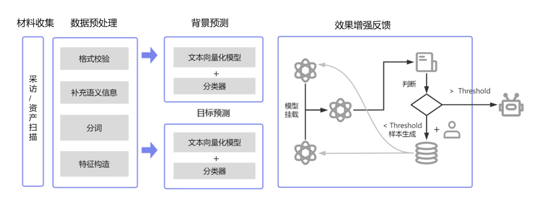 图中展示了大模型分类分级的流程,首先对元数据字典做预处理,进行语义的加工、中文的扩写以及短语的规范化。在此基础上,引入基于金融行业预训练的微调大语言模型,对他的背景进行预测,再对四级子类做精准预测,确保某一个字段能归到对应的、正确的二级大类下的四级子类。最后,对于异常的、错误的知识点,Defensor 也引入了增强效果反馈系统,通过少量人工补录的流程,可以形成一个模型的迭代,再做一次预训练,同时慢慢形成高质量、高可用、准确率高的金融行业分类分级大模型。