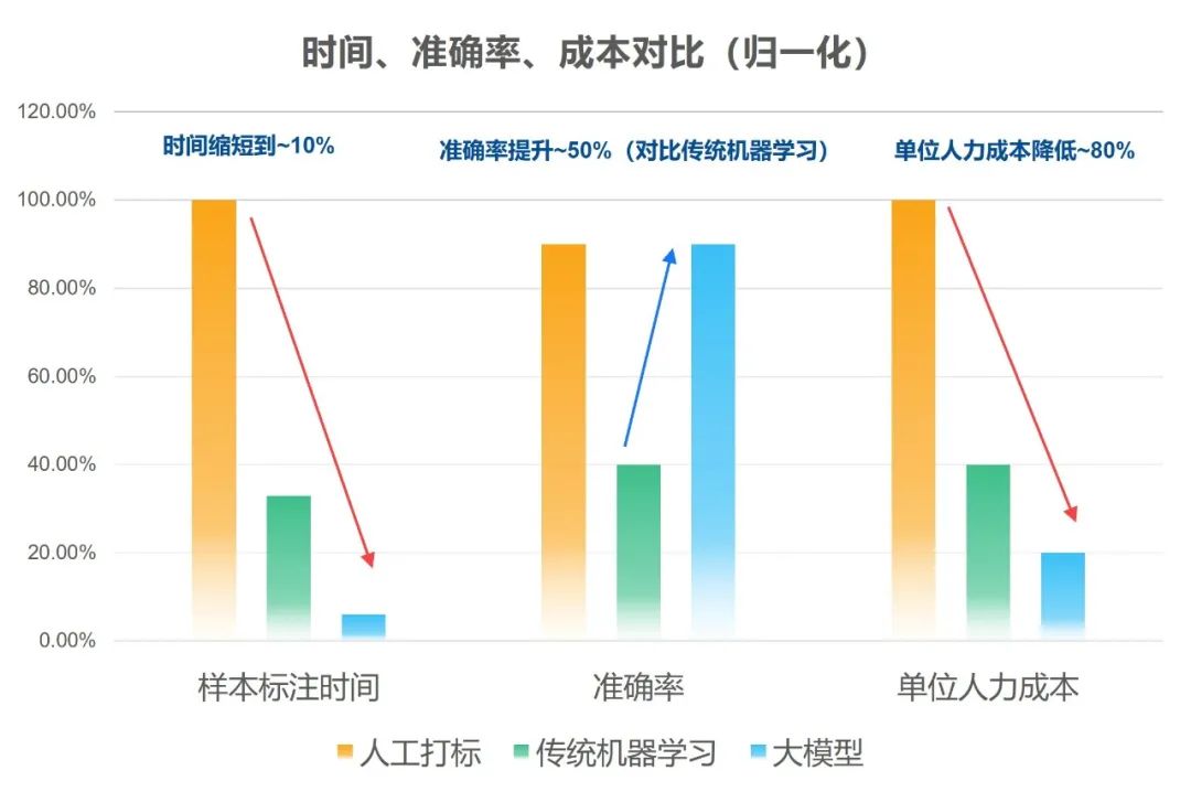 下图是引入大模型之后分类分级的效果对比图,其中时间缩短到原本的10%,准确率相比传统机器学习提升 50%,单位人力成本降低 80%。