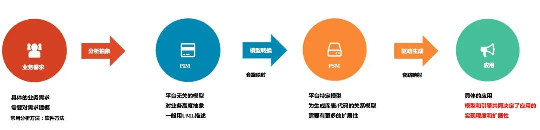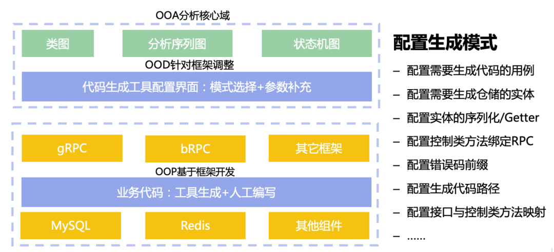 我们此前根据领域模型在生成代码方面进行了一些探索,希望用建模时间高倍率置换编码时间。随着代码工具的不断完善,效率提升越来越难,因为模型是抽象的而实现是具体的,模型所承载的信息并不足以直接生成代码,一定需要“人”来补充信息,这部分工作工具无法替“人”来完成。