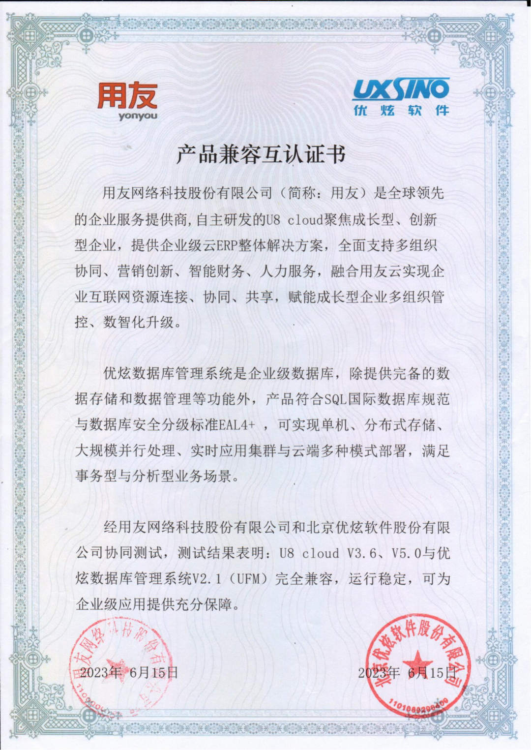 历经数月的全面开发、测试、原型验证,近日优炫数据库与用友信创云ERP U8 cloud产品完成兼容性适配。测试结果显示,双方产品相互兼容,整体运行稳定高效,同时能够满足性能需求。