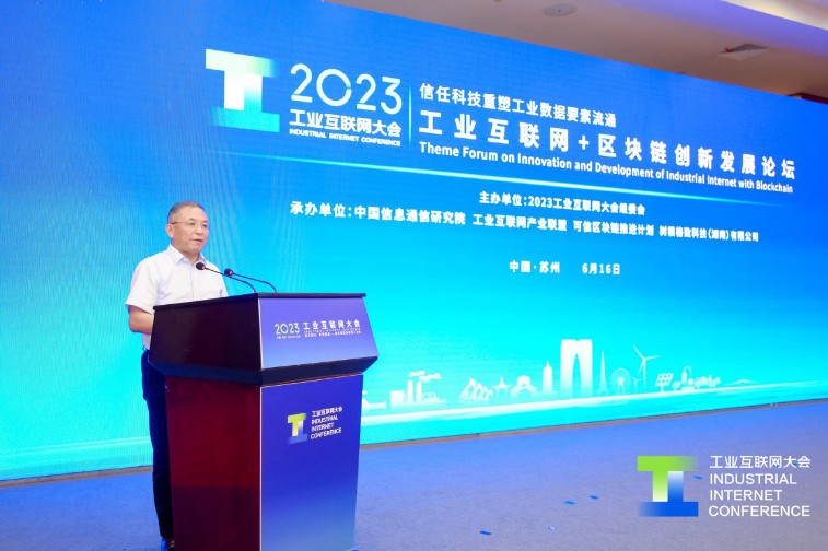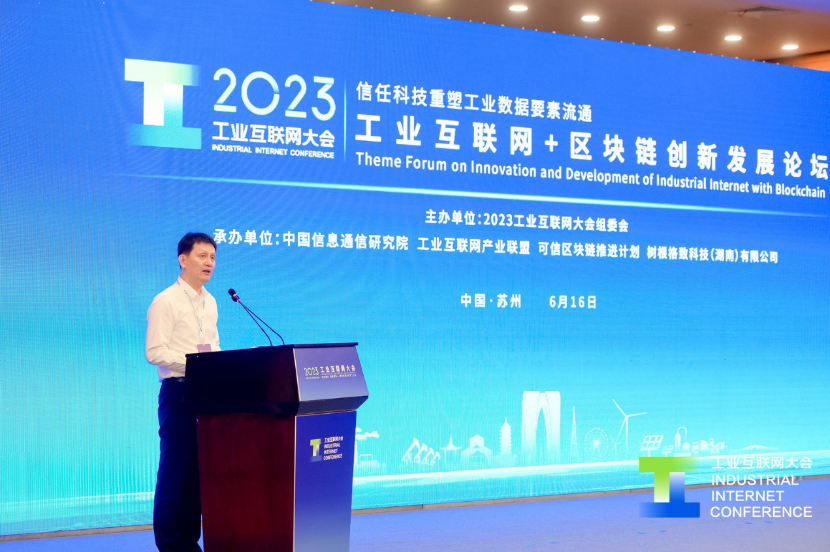 2023年6月16日下午,以“信任科技重塑工业数据要素流通”为主题的2023工业互联网大会——工业互联网+区块链创新发展论坛在苏州举办。论坛由中国信息通信研究院(以下简称“中国信通院”)、工业互联网产业联盟、可信区块链推进计划、树根格致科技(湖南)有限公司联合承办。中国信通院总工程师敖立,江苏省数字经济学会监事会主席、江苏省区块链发展协会秘书处司方来出席会议并致辞,论坛由树根互联股份有限公司高级副总裁王锦霞主持。