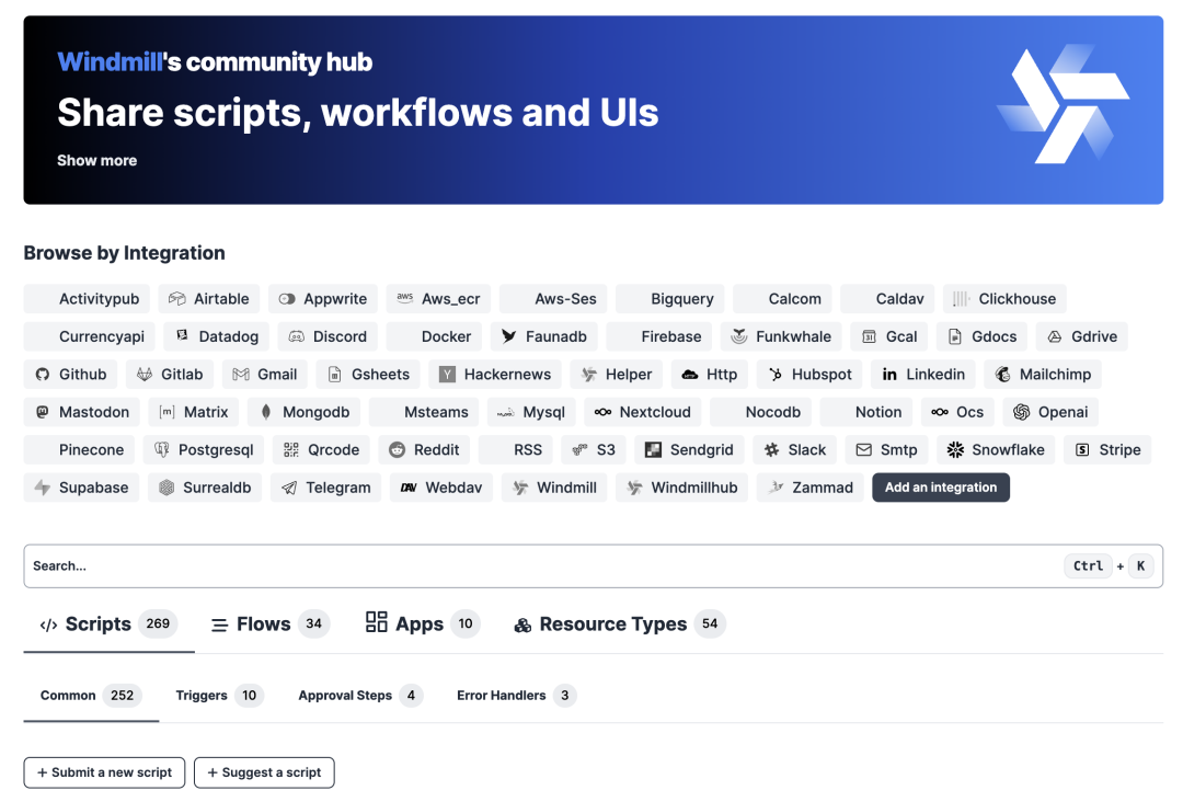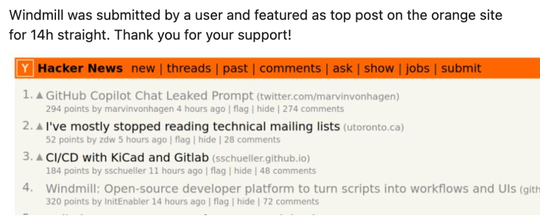 Windmill (http://github.com/windmill-labs/windmill) 可以看做是 Airplane 的开源替代品 Temporal 的低代码替代品,支持把 Python/Typescript/Go/Bash 脚本快速转换为内部工作流或应用程序。比如自动化用户注册后自动发邮件,跟踪用户活动,根据他们的使用触发特定操作这些工作流(可以流程化的事儿都交给机器了),因为是低代码工具,所以只有少量编程经验的用户也可以使用。Windmill 有个 Hub (https://hub.windmill.dev/),大家可以在 Hub 分享脚本,其他人可以通过 Windmill 轻松转换为内部应用程序,这个能吸引寻找特定问题解决方案的用户,对 SEO 和转化率应该也很有帮助(模板库就是 Notion 获得新用户的重要步骤)。重视用户没有白费,一个月前他们某用户把 Windmill 投稿到了 HN,在首页直接待了 14h。