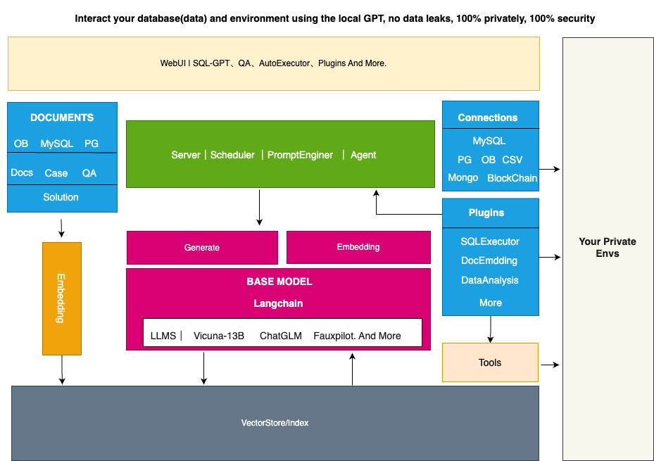 使用大型语言模型的同时,数据安全和隐私也都受到了挑战,DB-GPT (http://github.com/csunny/DB-GPT) 是一个数据库相关的 ChatGPT 项目,可以本地部署大语言模型和数据,也可以直接本地部署 DB-GPT 连接到私有数据库。核心能力包括 Chat2sql,执行 SQL,处理数据,存储/索引向量,管理大模型等。