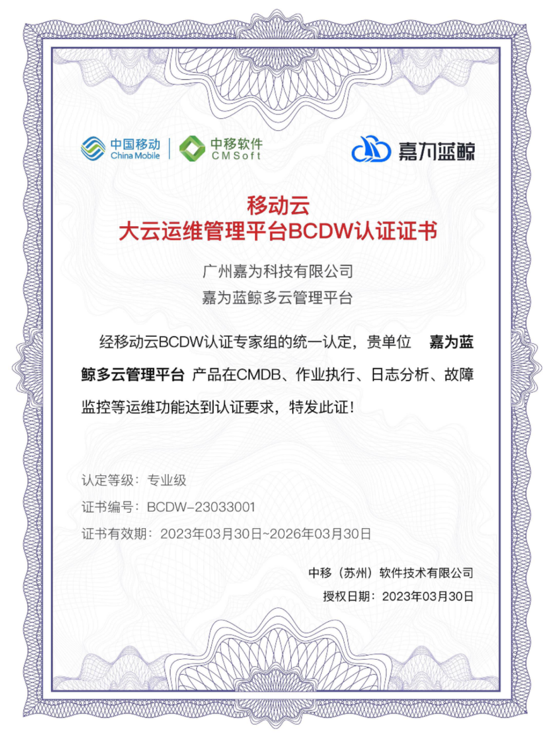 本次认证,嘉为蓝鲸多云管理平台经过适配对接、测试评审,最终从激烈的竞争中脱颖而出,以第一名成绩通过首批BCDW生态认证。