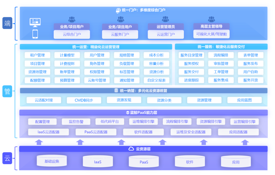 作为嘉为蓝鲸旗下产品之一——嘉为蓝鲸多云管理平台,是基于腾讯蓝鲸PaaS平台,构建从IaaS -> PaaS -> SaaS、从基础设施 -> 软件 -> 应用的全栈一体化云平台,提供云管理、云服务、云运维、云运营、云门户等综合性多云管理能力。面向业务开发运维人员提供应用运行资源环境服务以及全生命周期管理,同时能够整合运维支撑工具,面向IT管理员提供多云环境下的运维、管控、运营服务,为IT管理员简化多云环境下的工作。通过多云管理平台的跨云管理能力,实现跨云厂商的资源调配,提升云资源的利用率,降低企业成本,帮助企业的数字业务获得竞争力。