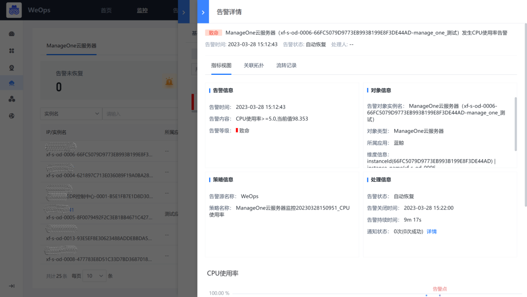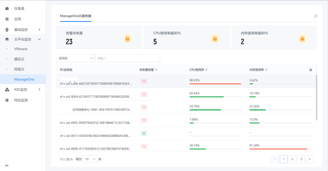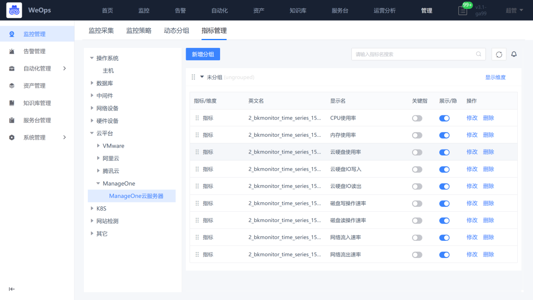 WeOps之前版本已具备VMware、阿里云和腾讯云等相关资源的监控和告警,V3.16版本继续扩充,增加华为ManageOne云平台的云服务器的监控和告警,以便对纳管的云平台的资源进行时时监控,及时发现问题和故障。