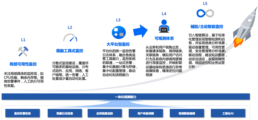 可观测体系的建设,我们分为五个层级。目前,大多数企业都历经了监控的前三个层级的建设:L1-局部可用性监控、L2-烟囱工具式监控、L3-大平台型监控,并且正在向L4-可观测体系建设迈进,向L5-智能监控方向进行探索。在此过程中,有几种变化: