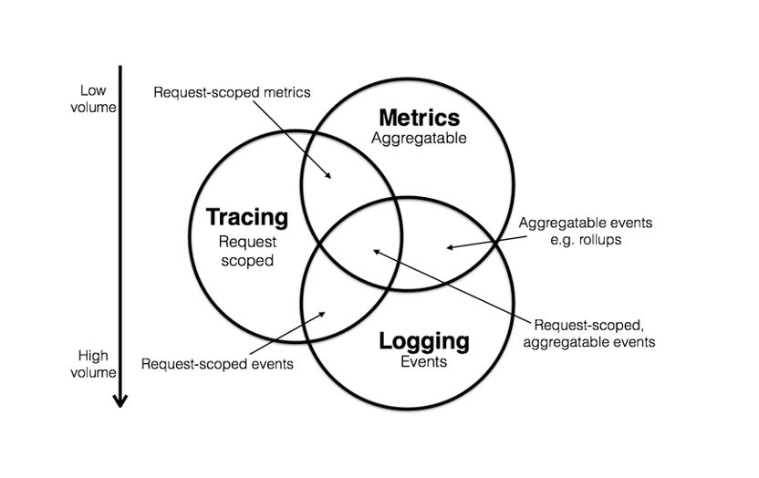 Peter Bourgon 在2017年2月撰写了一篇简明扼要的文章《Metrics,tracing,and logging》,文中将观测数据按数据类型和应用场景,划分为链路数据 trace、时序指标数据 metric、明细日志文本数据log,这也是目前可观测体系三大支柱的理论来源。