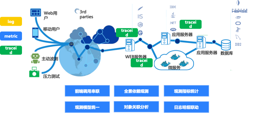 以应用为中心,将性能指标、运行日志、服务事件、请求链路进行统计聚合、关联分析,建立服务全景观测中枢,实现服务性能度量、预测,提供故障根因及性能分析依据。