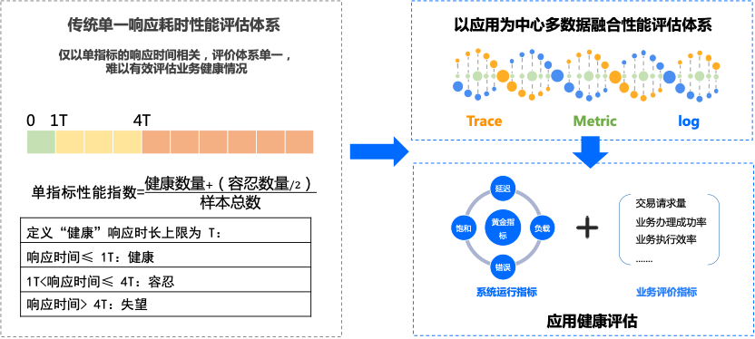 不同维度的观测数据统一接入后,需要对数据进行清洗、关联、聚合,构建以应用为中心,融合trace、metric、log多维数据的应用性能评价体系,从而基于业务视角,统一性能评价标准、主动发现性能瓶颈、快速感知故障、高效故障恢复,保障应用系统连续稳定。